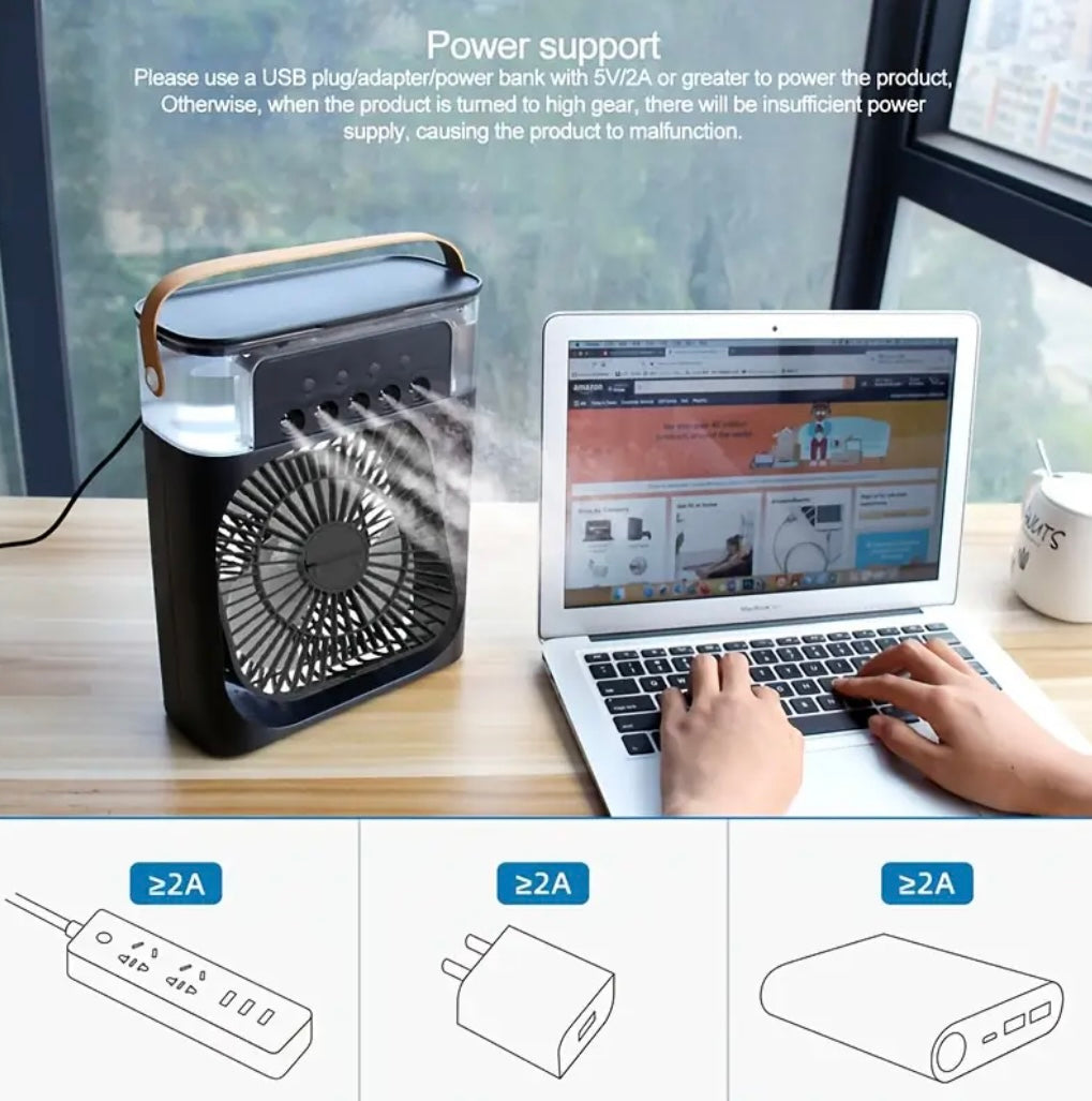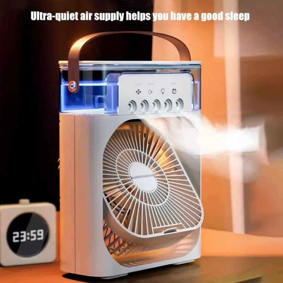 Beat the heat and enjoy fresh, cool air wherever you are with the 3-in-1 Portable AC Fan with LED Night Light. Designed for homes, offices, dorms, and travel, this multifunctional device works as a cooling fan, air humidifier, and ambient LED light – giving you comfort and style in one compact design.